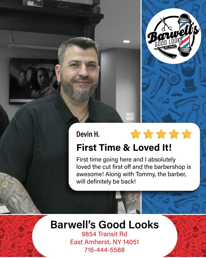 Devin stopped by for a fresh cut with Tommy and left looking (and feeling) sharp โ thatโs what weโre all about at Barwellโs Good Looks.