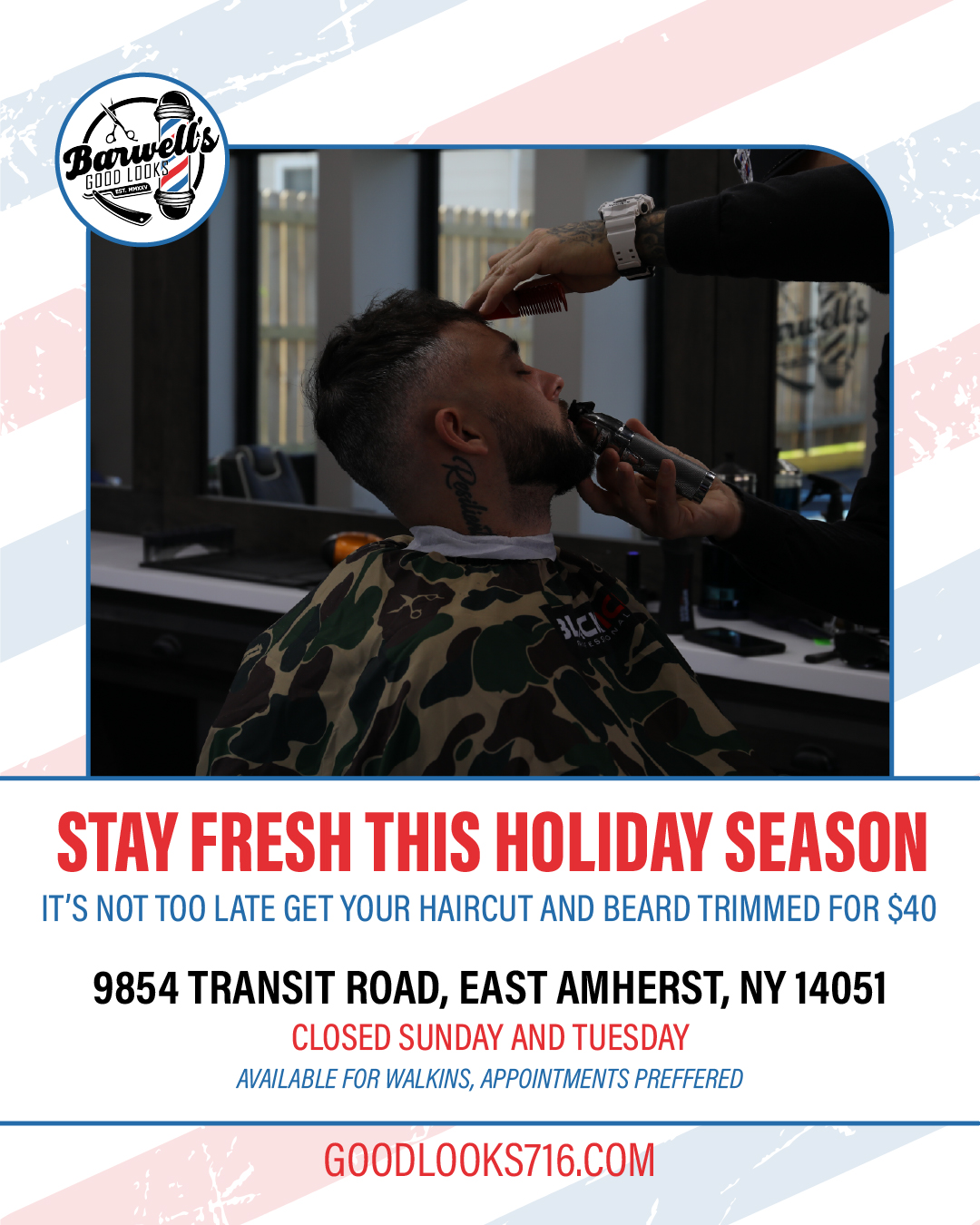 #BarwellsGoodLooks #FreshForTheHolidays #BuffaloBarbers #716Style #BeardTrim #HolidayReady #EastAmherstNY #BuffaloNY #CleanCutSeason #BarbershopVibes