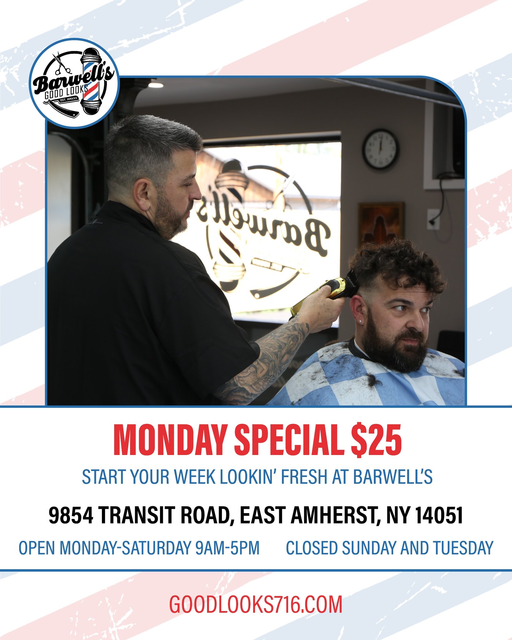 Start your week with a fresh cut! ๐ Every Monday at Barwellโs, haircuts are just $25. No better way to kick off the week lookinโ sharp. โ๏ธโจ โข ๐ 9854 Transit Rd, East Amherst, NY 14051 ๐ Open MonโSat | Closed Sun & Tue โข ๐ Book your spot now: goodlooks716.com โข #BarwellsGoodLooks#GoodLooks716#StaySharp#FreshFade#BuffaloBarber#LookGoodFeelGood